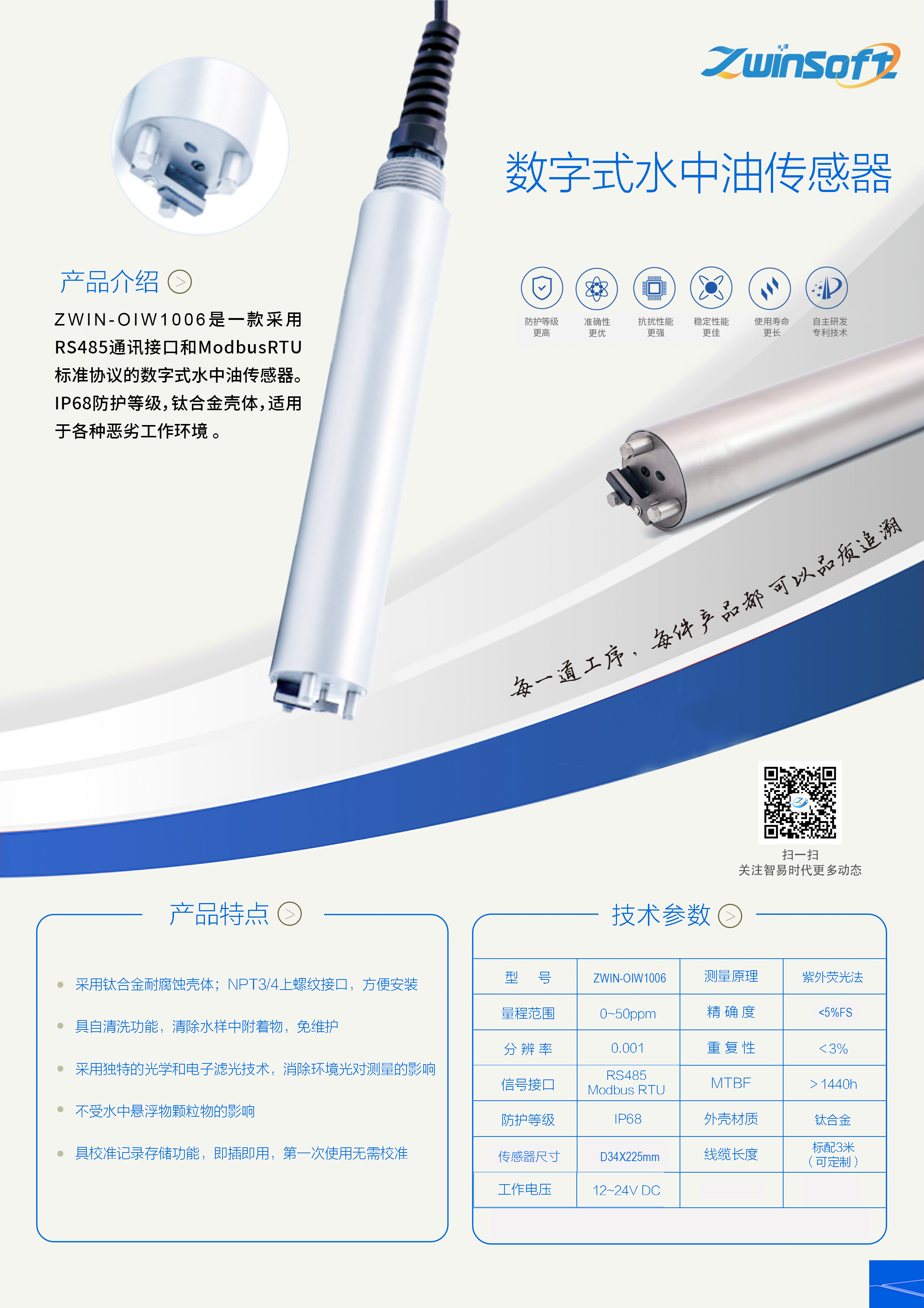 ZWIN-OIW1006是一款采用RS485通訊接口和ModbusRTU標(biāo)準(zhǔn)協(xié)議的數(shù)字式水中油傳感器。IP68防護(hù)等級(jí),鈦合金殼體,適用于各種惡劣工作環(huán)境。