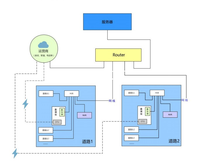 道路交通空氣質(zhì)量監(jiān)測(cè)系統(tǒng)可以將兩個(gè)及以上的道路段區(qū)域進(jìn)行連接,多方位監(jiān)控,并通過無線路由器將數(shù)據(jù)上傳到一個(gè)服務(wù)器,方便運(yùn)營商的操作與管理。下圖為系統(tǒng)的網(wǎng)絡(luò)拓?fù)浼軜?gòu)圖。